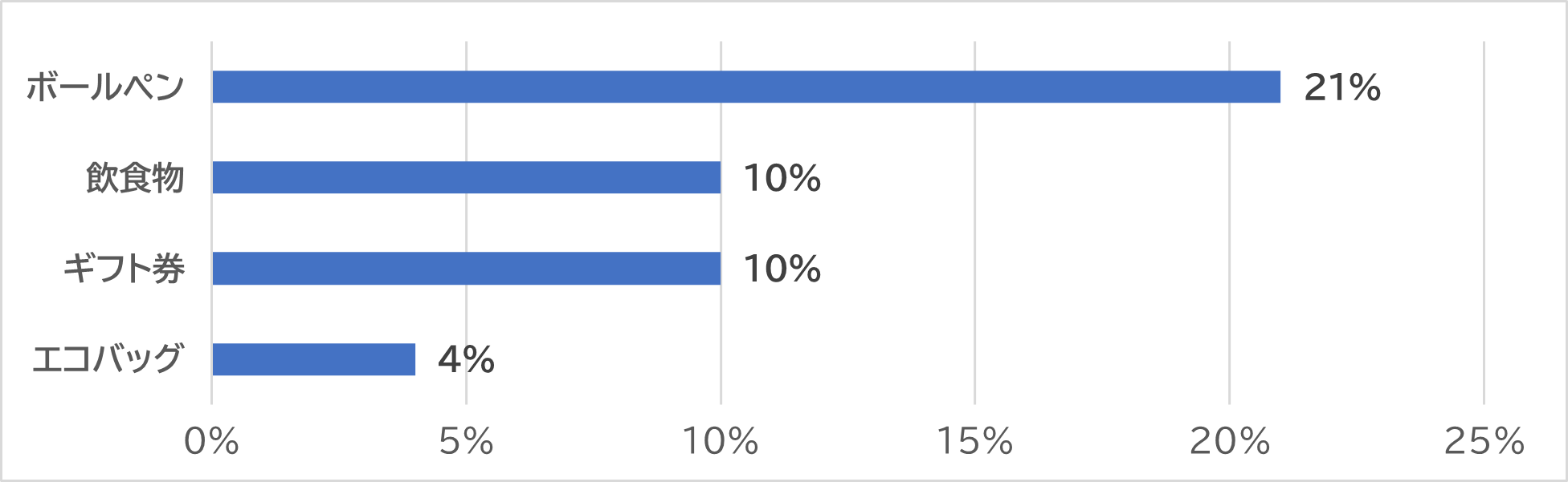 過去にノベルティを受け取ったことがあるかをたずねたところ、全体で「受け取ったことがある」と回答した人の割合は48%。過去にノベルティを受け取ったことがある人に、もらって嬉しかったノベルティを質問したところ、「ボールペン」が21%、果物やコーヒー等の「飲食物」とAmazonギフト券やQUOカードのような「ギフト券」が10%、「エコバッグ」が4%という結果になりました。その他、特注のマスク、うちわやカイロ等の時世や季節に伴ったノベルティも人気がありました。