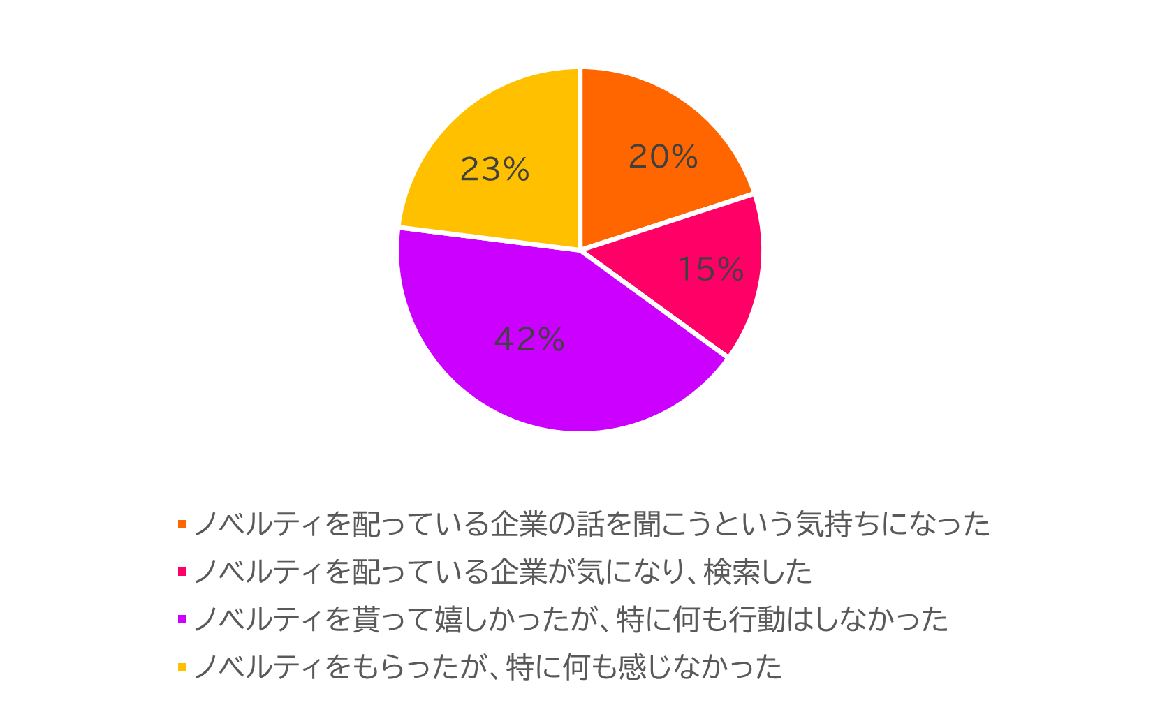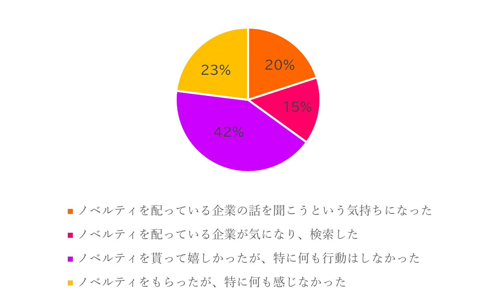 「ノベルティを貰って嬉しかったが、特に何も行動にうつさなかった」人が約半数をしめていますが、残りの半数の35%は企業に興味をもち、そのうちの20%は「ノベルティを貰ったことで、企業の話を聞こうという気持ちになった」と感じています。