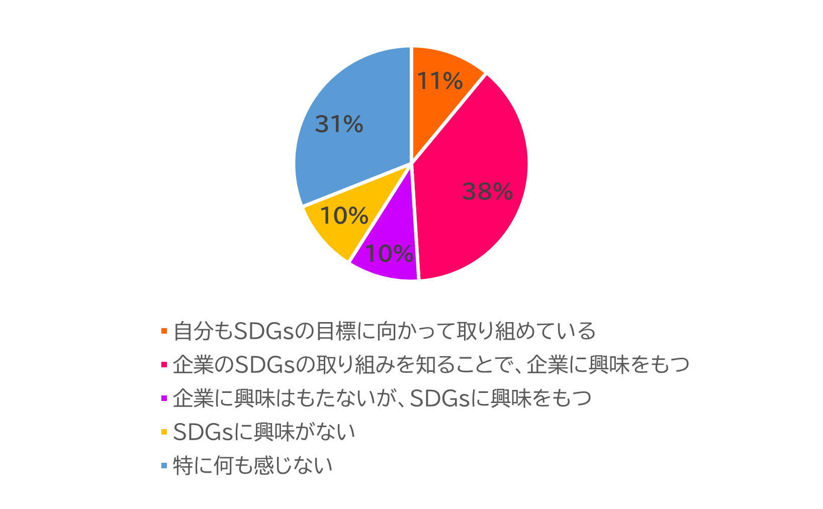 SDGsに関連する商品を受け取ることで、「企業のSDGsの取り組みを知ることで、企業に興味をもつ」という感じる人が38%、「自分もSDGsの目標に向かって取り組めている」と感じる人が11%、「企業に興味をもたないが、SDGsに興味をもつ」と感じる人が10%という結果になりました。