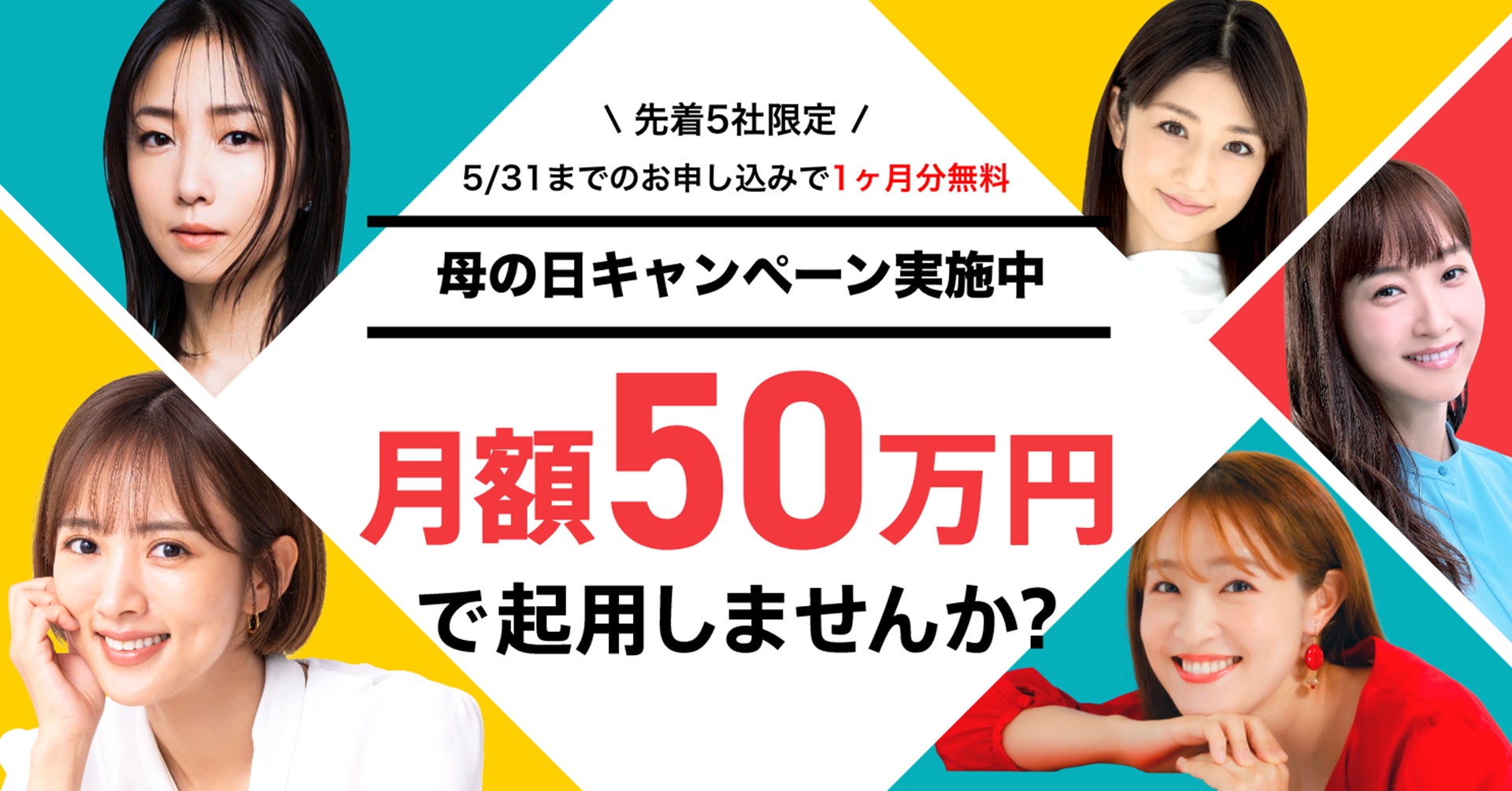 MEGUMIさん、夏菜さんをはじめとする人気女性タレントの肖像利用が可能「ママサポーターズクラブ」が母の日キャンペーンを開催!先着5社限定で利用料の1ヶ月分が無料に