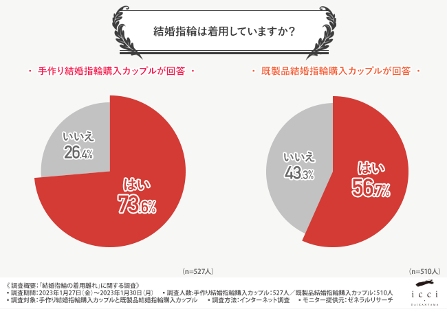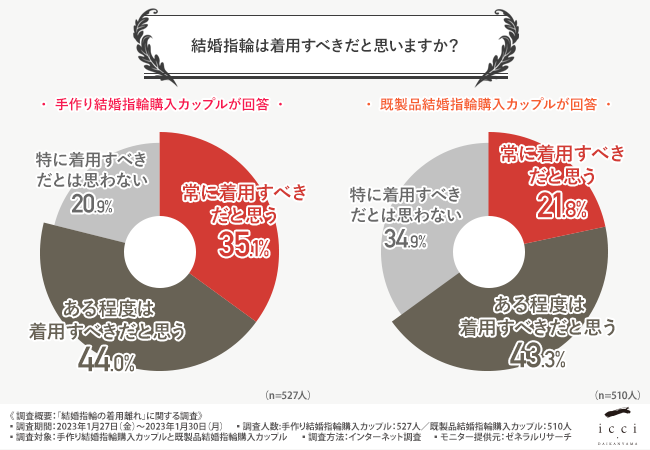 そこで今回、手作り結婚指輪・婚約指輪・ペアリング専門店『icci 代官山』を運営する株式会社一は、手作り結婚指輪購入カップルと既製品結婚指輪購入カップルを対象に、「結婚指輪の着用離れ」に関する調査を実施しました。