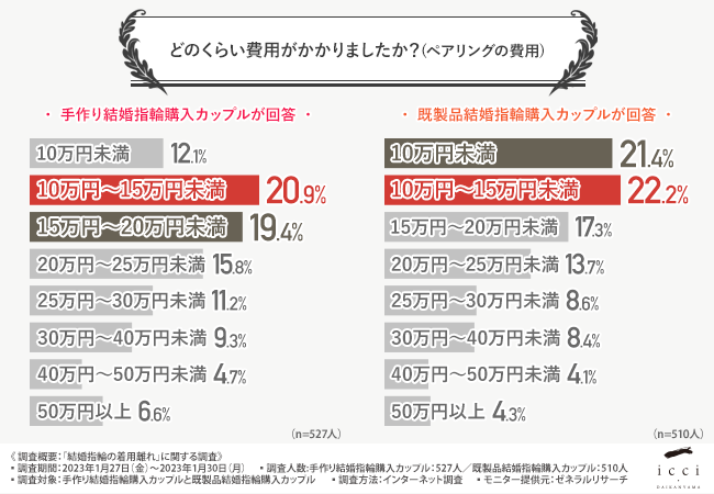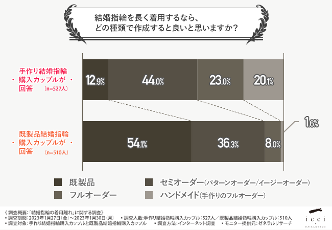 【調査人数】1,037人(手作り結婚指輪購入カップル:527人/既製品結婚指輪購入カップル:510人)