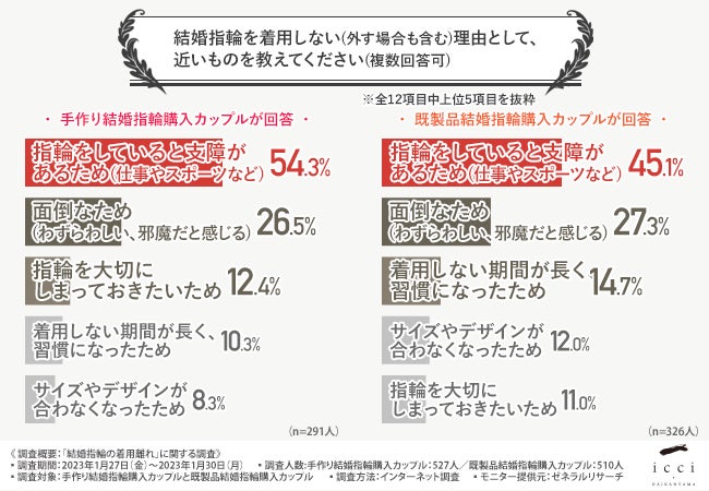 【手作り結婚指輪購入カップル】『指輪をしていると支障があるため(仕事やスポーツなど)(54.3%)』『面倒なため(わずらわしい、邪魔だと感じる)(26.5%)』『指輪を大切にしまっておきたいため(12.4%)』
