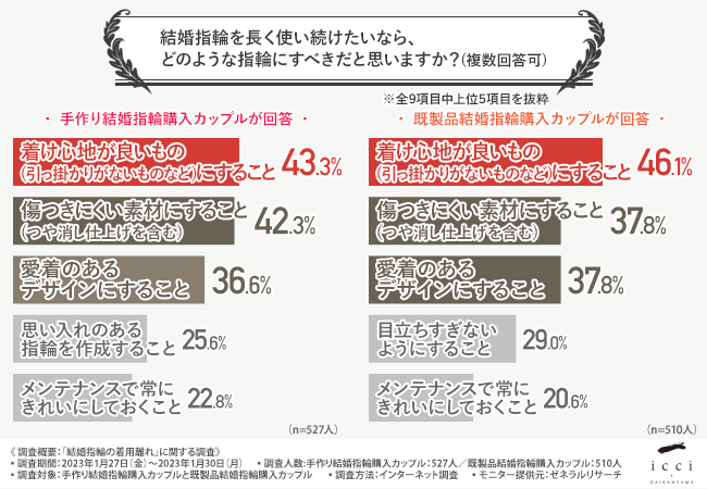 しかし、4位以降をみると、手作り結婚指輪では「思い入れのある指輪を作成すること」の25.6%が4位だったのに対して、既製品の場合は、「目立ちすぎないようにすること」の29.0%が4位となりました。