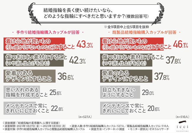 【手作り結婚指輪購入カップル】『着け心地が良いもの(引っ掛かりがないものなど)にすること(43.3%)』『傷つきにくい素材にすること(つや消し仕上げを含む)(42.3%)』『愛着のあるデザインにすること(36.6%)』