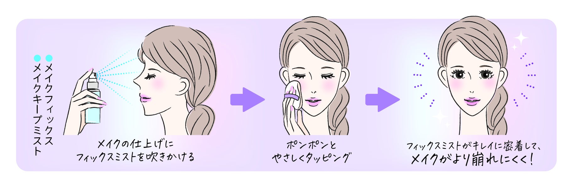 メイクフィックスミストを顔に吹きかけてから、パフでやさしくタッピングすると