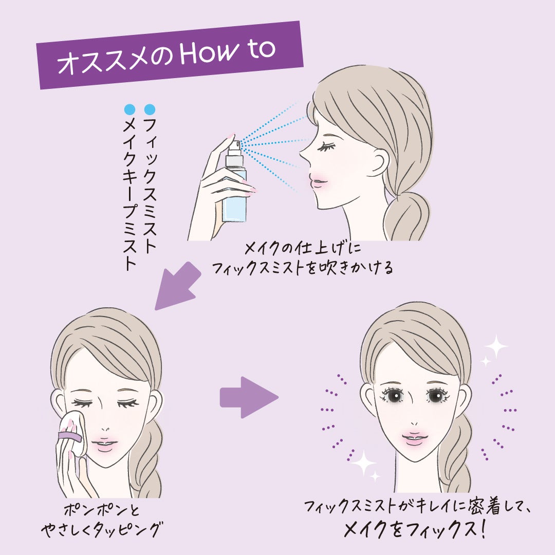 フィックスミストを顔に吹きかけてから、やさしくタッピングしておさえると、メイクの密着感がアップします。