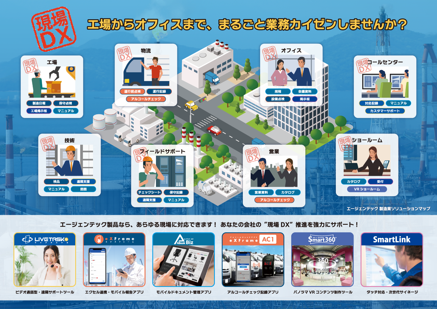 本展示会では、主にフィールド業務におけるペーパーレス化や遠隔地とのリモート・コミュニケーションの円滑化など、お客様のビジネスの業務改善をはかる“現場DX”をご提案いたします。