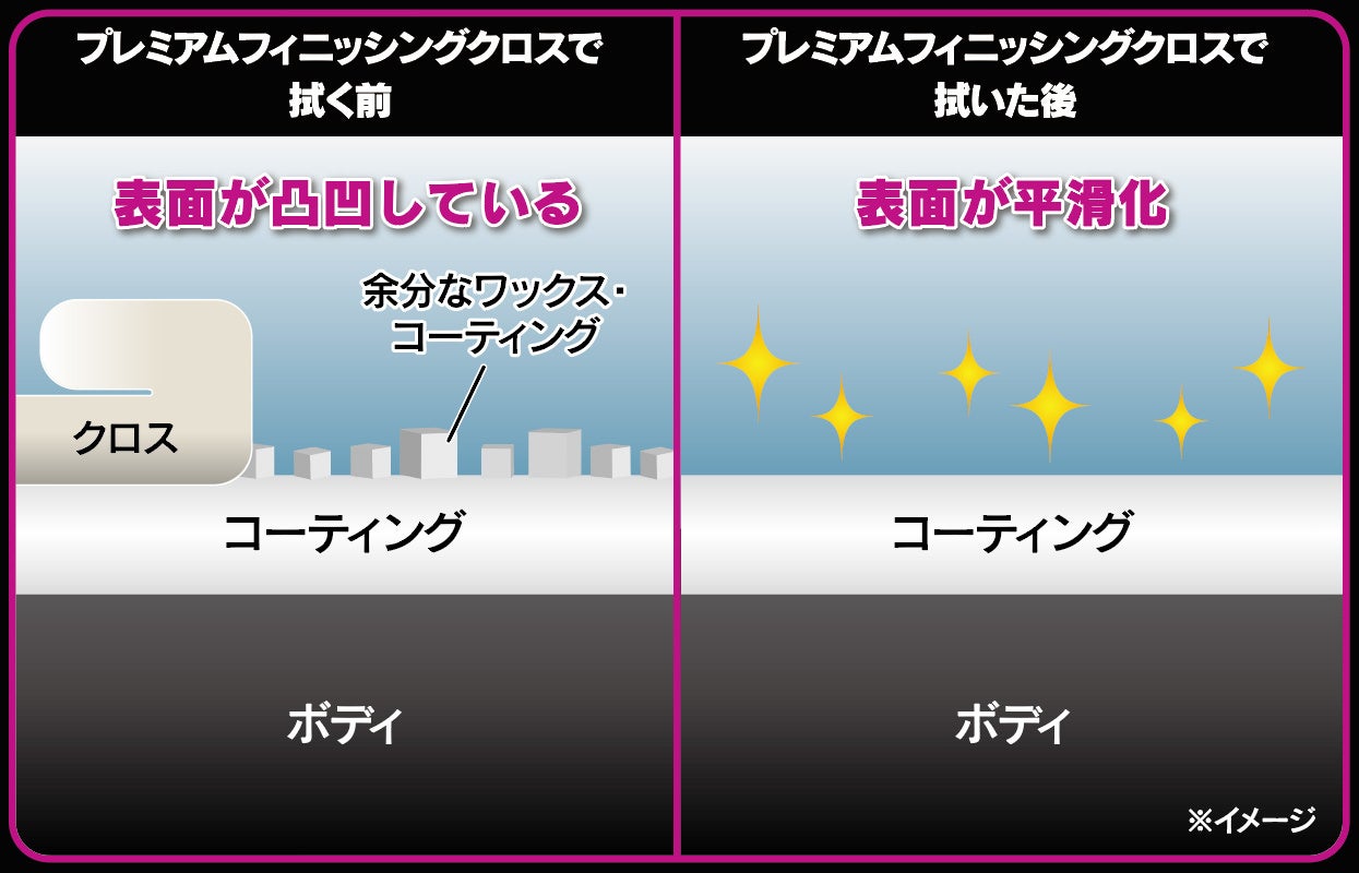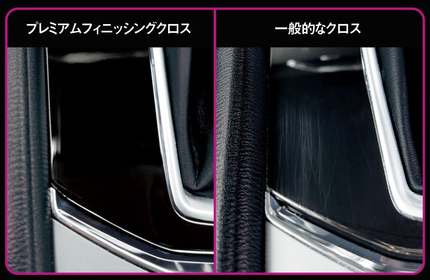 プレミアムフィニッシングクロスは、目に見えない余分なワックス・コーティングや汚れだけをやさしく拭き取り、艶・光沢を更に引き立てます。
