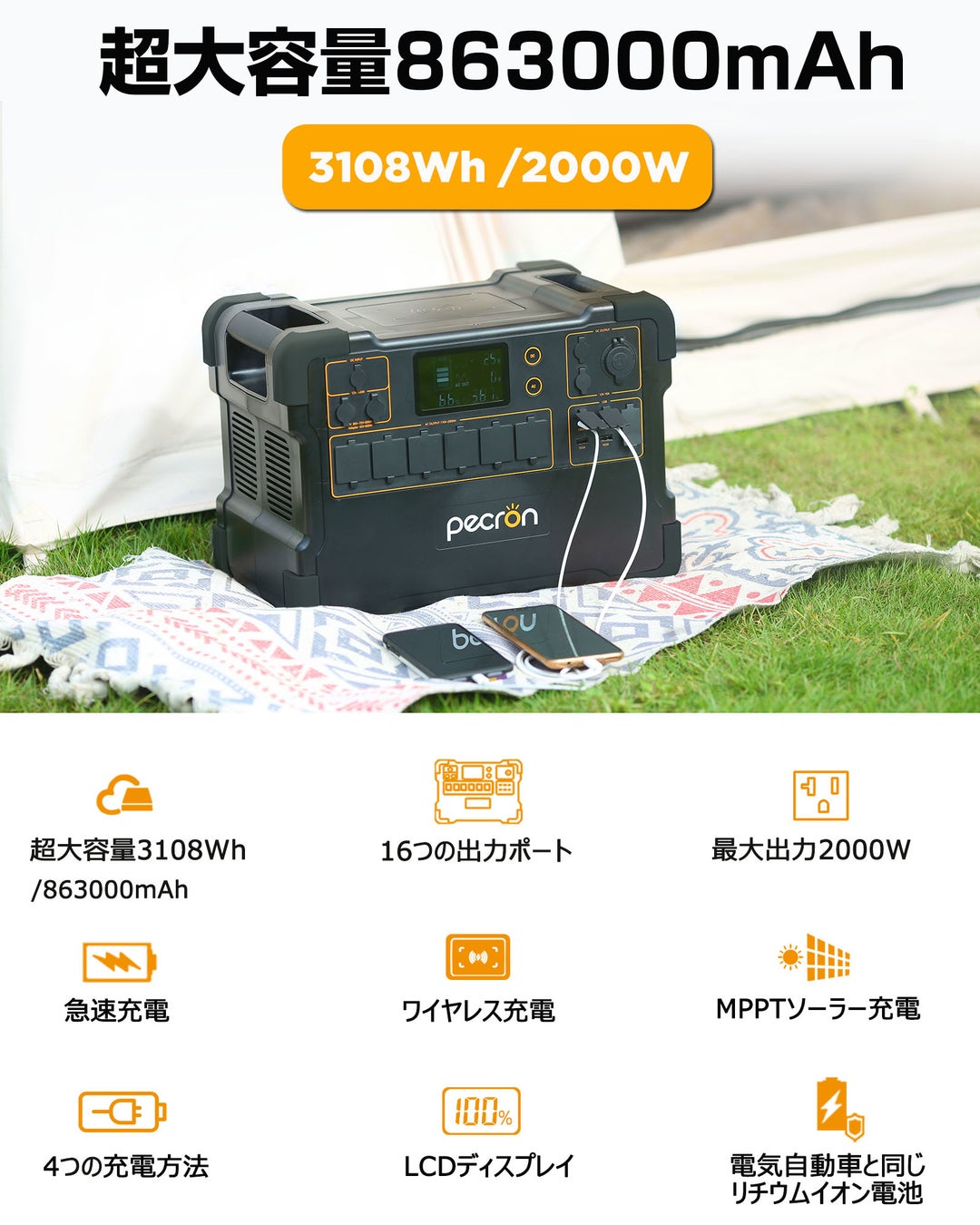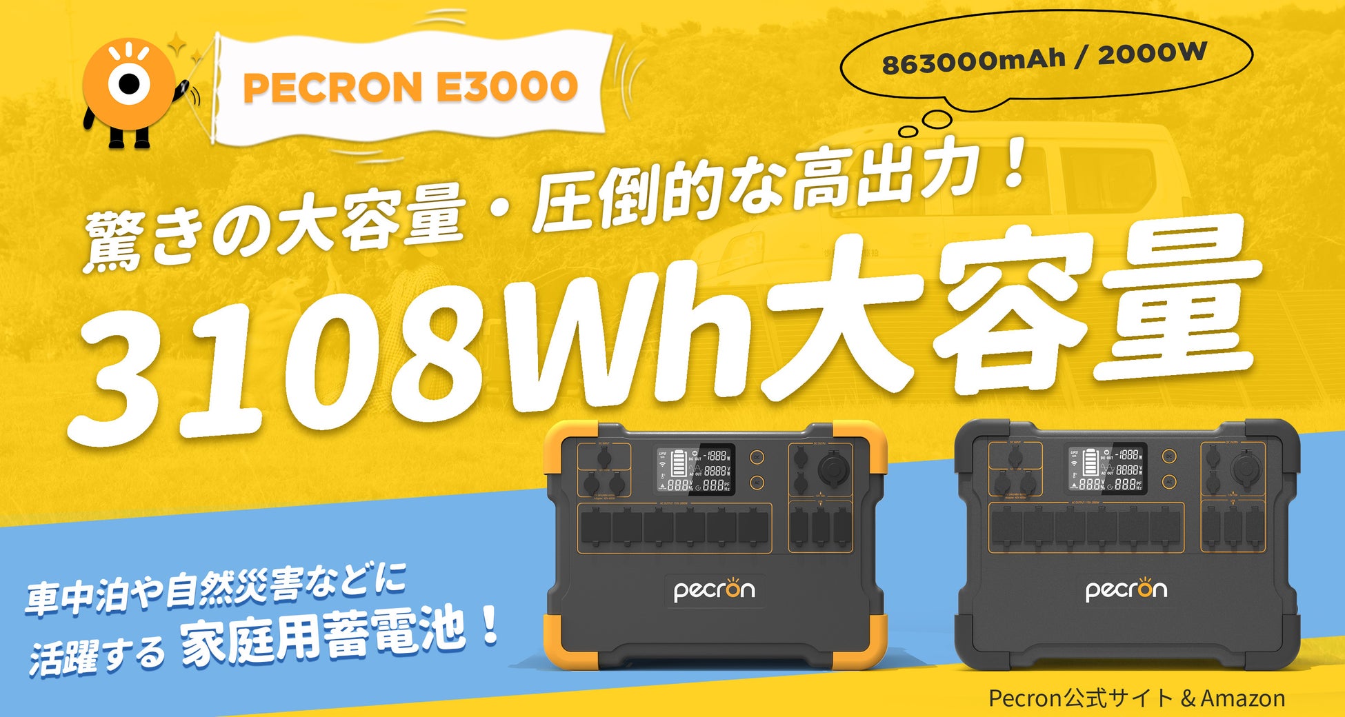 「PECRON E3000」は高機能・高品質・お求め安いポータブル電源として、3108Wh/863000mAhの超大容量、2000Wの高出力「瞬間最大出力4000W」と持ち運びやすさを兼ね備えた、コンセントのない場所で様々な電気製品に給電可能。