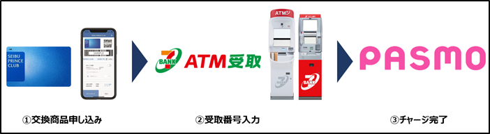 本サービスは、「SEIBU PRINCE CLUB」での交換商品申し込みにより PASMO へのチャージに必要な番号を発行後、セブン銀行ATMにてお手続きいただくと、SEIBU Smile POINTの1ポイントを1円分としてPASMOへチャージできるものです。1回あたりのチャージ金額は100ポイント以上5,000ポイント以内で1ポイント単位の設定ができ、月1回までポイント交換手続きが可能です。