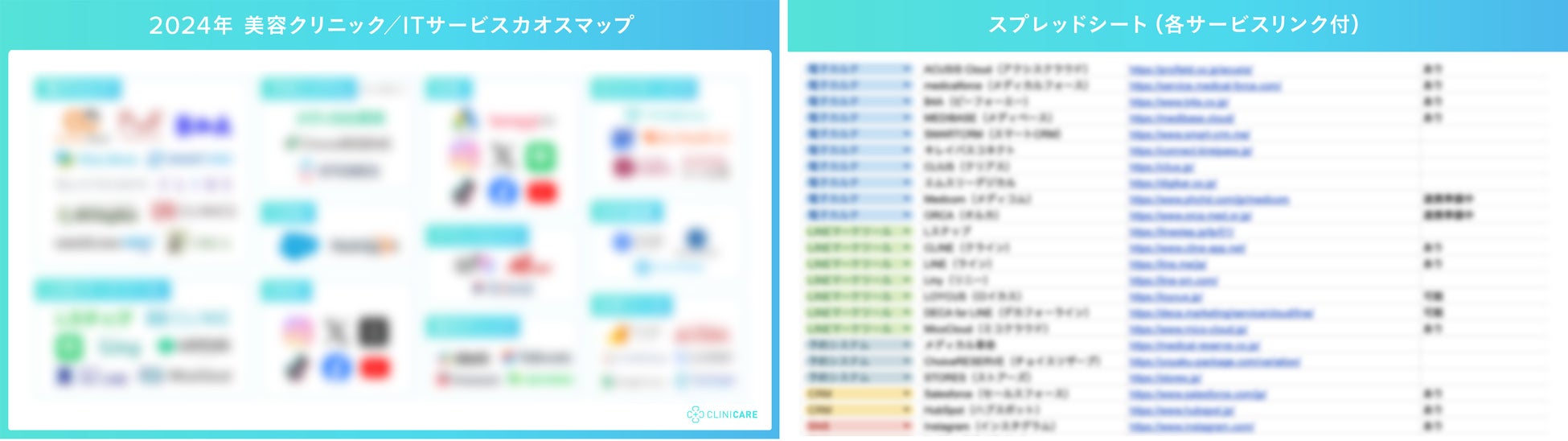 そこで、クリニケア株式会社では約50の自由診療クリニックにヒアリング調査を実施。各クリニックが実際にどういったITサービスを活用しているかを、カオスマップ(PDF)にまとめました。