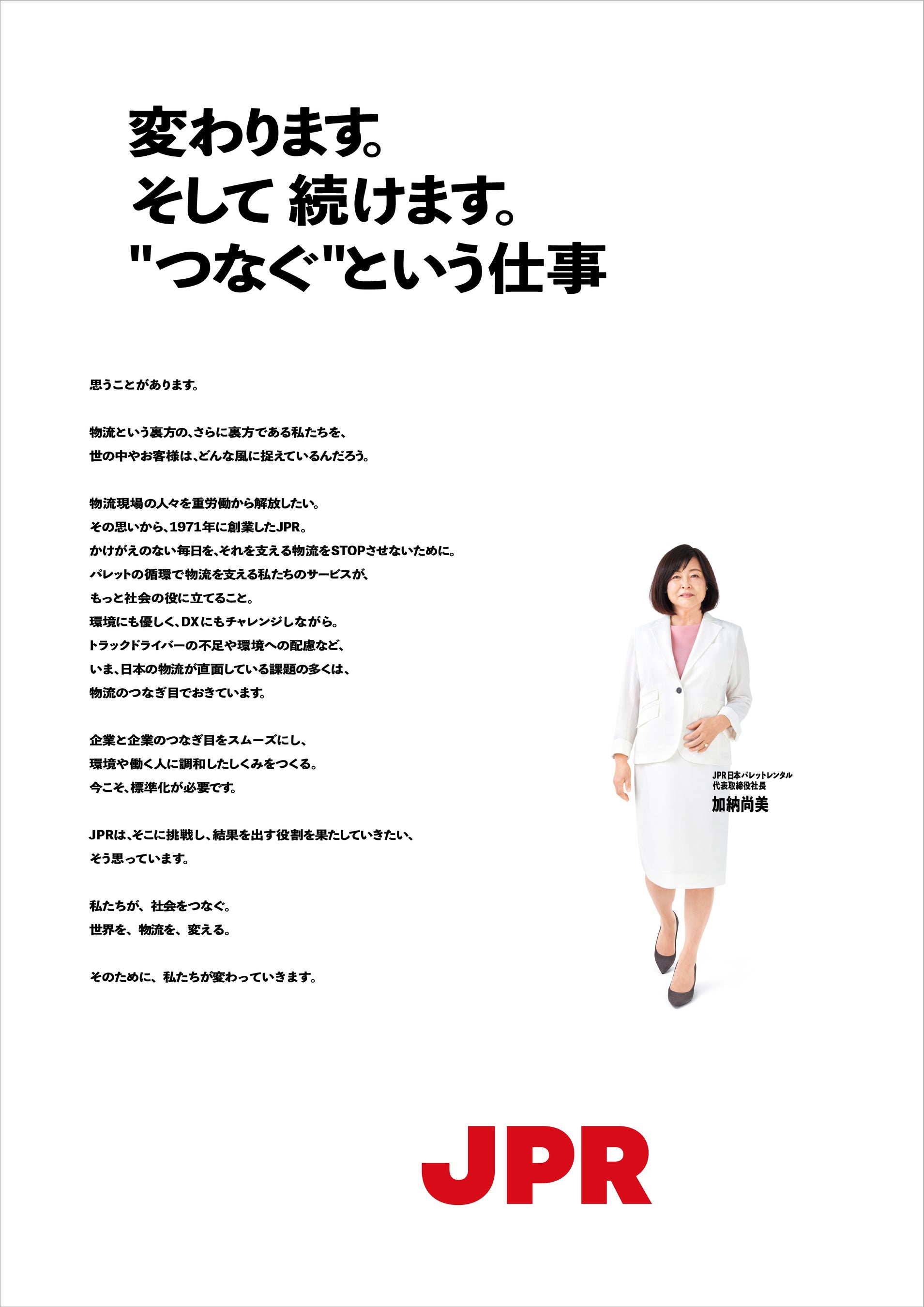 JPRは、創業以来50年にわたり物流用パレットのシェアリングのしくみを通じて、企業と企業をつなぐ仕事に挑戦しています。激しく変化する社会のなかで物流業界はいま、かつてない変革期にあります。JPRはこれまでの独自性を活かしながら、自ら変化に挑むことによって、お客さま企業、そして社会の期待に応えていきます。
