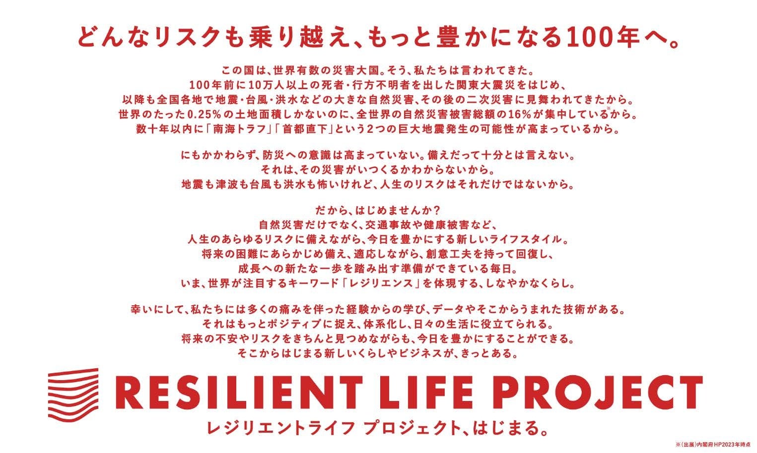 ⾃然災害のリスクをはじめ、社会に起因するリスク、そして個⼈に起因するリスクに⾄るまで、あらゆるリスクが⽣み出す困難を乗り越えるための「レジリエンス」を⾼め、より豊かな⽣活の実現を⽬指す、新しいライフスタイルです。