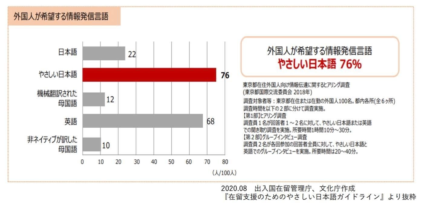 普段使っている日本語を外国人にもわかりやすくした日本語のこと。1995年の阪神・淡路大震災の時、外国人が十分な情報を理解できずに被害にあったことから、考えられました。現在は災害時だけでなく、生活情報や観光情報などを伝える手段として、あらゆる場面で使われています。