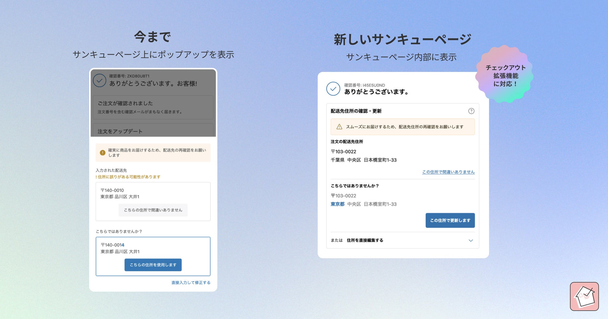「スマート配送先バリデーション」Checkout Extensibility アップグレード後のサンキューページで住所チェックを行えるようになりました