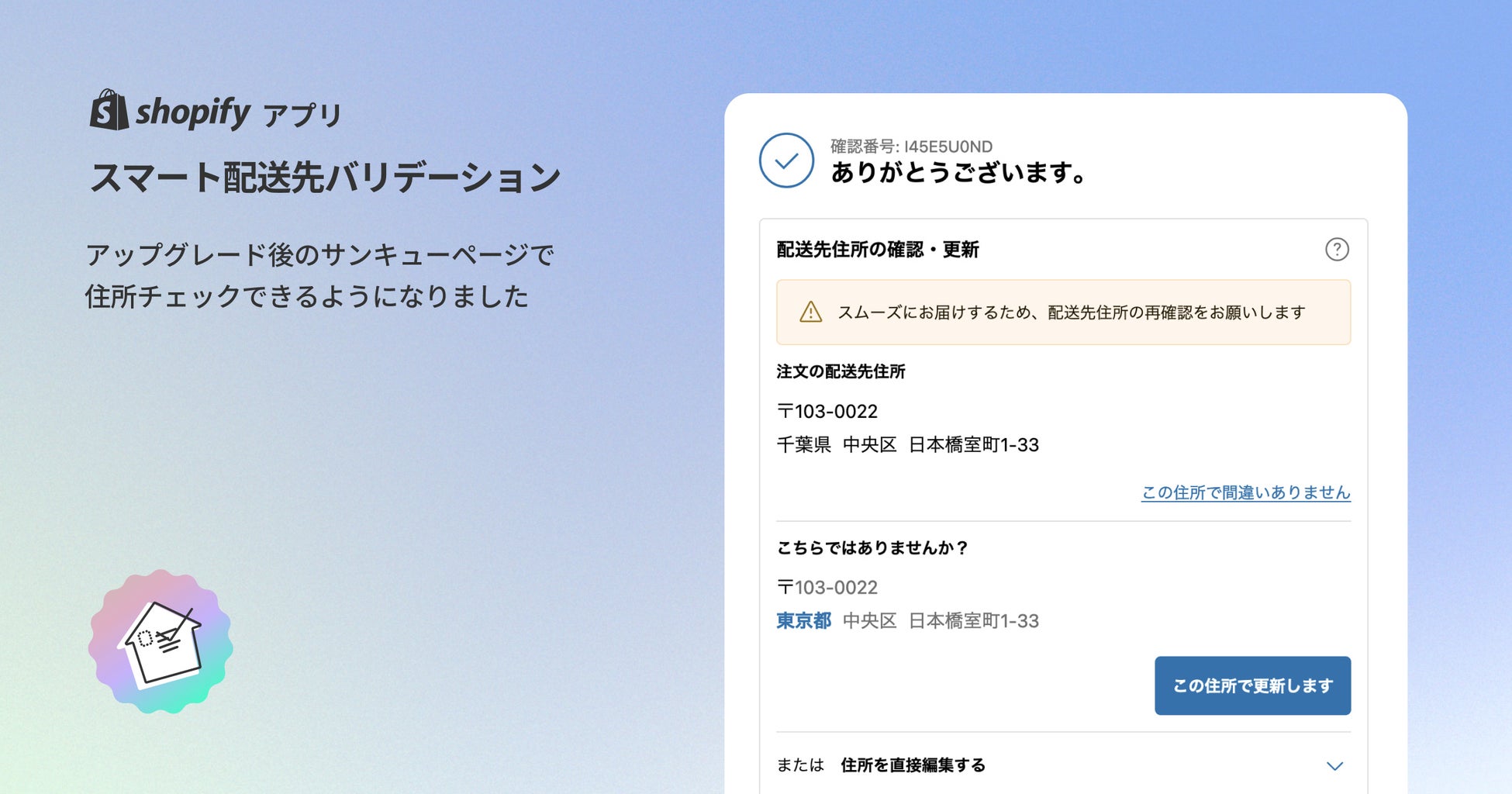 当アプリは、ショップでの注文完了後などのタイミングで配送先住所をチェックし、不備がある場合にサンキューページでお客様に住所の再確認と修正を促します。
