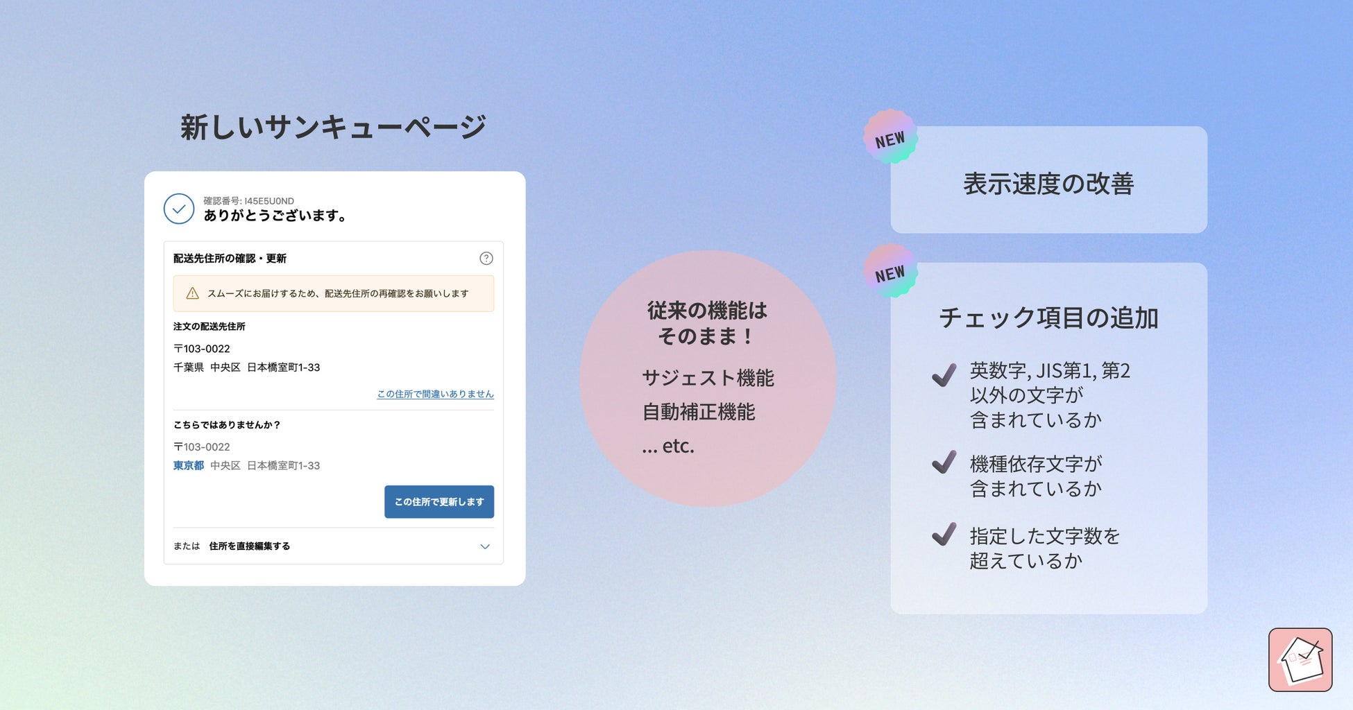 従来のバージョンではポップアップとして表示される形でしたが、拡張機能版ではページ内の要素として表示されるようになりました。また従来のスクリプト版に対して表示速度が大幅に改善されており、お客様がより住所不備に気づきやすくなりました。