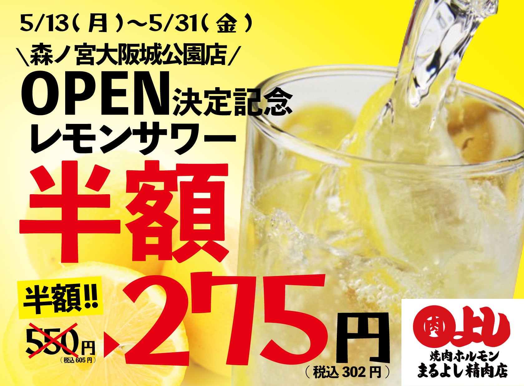 【森ノ宮大阪城公園店OPEN決定記念】卓上レモンサワー飲み放題が半額の60分275円|5月13日(月)〜5月31日(金)の平日、焼肉ホルモンまるよし精肉店全店で開催