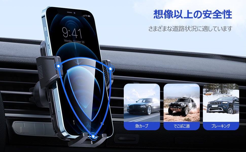 【携帯電話をしっかりロックする】車の携帯電話ホルダーはとてもタイトなので、携帯電話が落ちることはありません。またサイドアームの深さは最大で20mmです。すべてのケースとスマホリング、バッテリーケースはよく互換性があります。また、バンプロードやオフロード、急カーブにも対応しています。