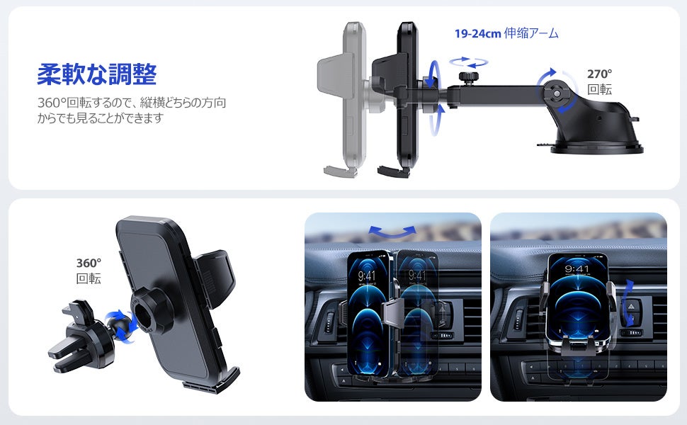 【360°調整可能な視野角】車載用スマホホルダーは、コンパクトで理想的なホルダーです。ボールヘッドは360°回転できるので、衛星ナビを水平にも垂直にも使用できます。ブラケットの長さは13~18.5cm、270°の範囲で調整できます。ボールヘッドとノブには滑りにくい素材を使用しており、より便利にお使いいただけます。最適な視点を得るための調整を行い、安全な運転に集中することができます。