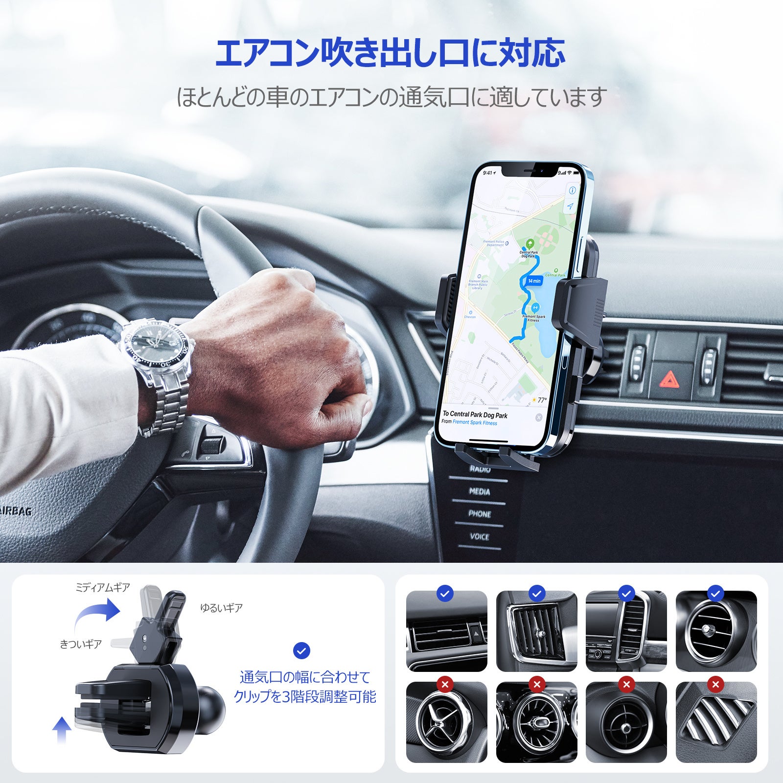 【2021スーパースマホホルダー】Syncwire 車載ホルダーは、しっかりとした通気クリップと吸盤ブラケットを備えているので、ダッシュボード、通気口やフロントガラスのガラスなど、複数の位置に柔軟にブラケットを設置することができます。換気口クリップは自由に調整でき、異なる厚さの換気口にしっかりと固定できます。厚い3Mゲル吸盤は、優れた吸引力を提供することができ、100%確実な取り付けを保証します。