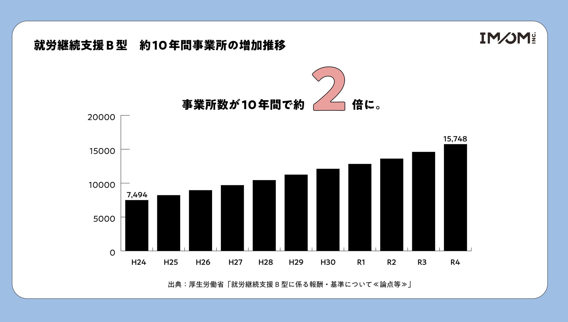 厚生労働省の資料によりますと、就労継続支援B型事業所は、直近10年間で、約2.1倍に増加をしております。また、就労継続支援B型事業所を利用する障がい者の人数は、R4年度時点において、約32万人存在いたします。