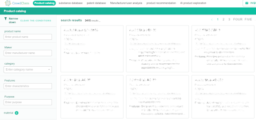 「CrowdChem Data Platform」は、国内外の特許や製品カタログなどの情報を独自に収集・集約したプラットフォームです。機械学習・自然言語処理の技術と組み合わせ、原料選定や顧客探索、用途・ニーズの探索、競合分析などを、本プラットフォーム上でスムーズに行うことができます。
