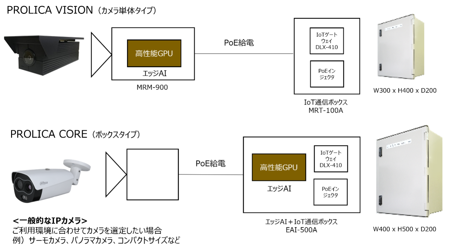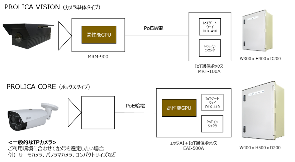 提供については、高性能GPUを内蔵したカメラ単体タイプ「PROLICA VISION」と、設置場所に応じてIPカメラが選べて、その映像を取り込みボックス内でAI処理をする、ボックスタイプ「PROLICA CORE」の2種類を選択可能とし、様々な現場で対応できるようになっております。これまで数々の建設現場においてPoCを繰り返してきたノウハウを、ライブラリ化し、様々なAIモデルをお客様が選びやすい形でご提供いたします。