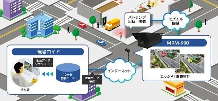 さらに、解析済データをクラウドサーバに蓄積することにより、異常検知時に遠隔地からのより的確な指示の発出に寄与することに加え、エコモット製品であるポータブル太陽光発電システム「SOBAT」による電源供給、パトランプやLED文字表示板との連動をはじめ、現場ニーズを踏まえた1現場完結型のソリューションとしての提供が可能です。