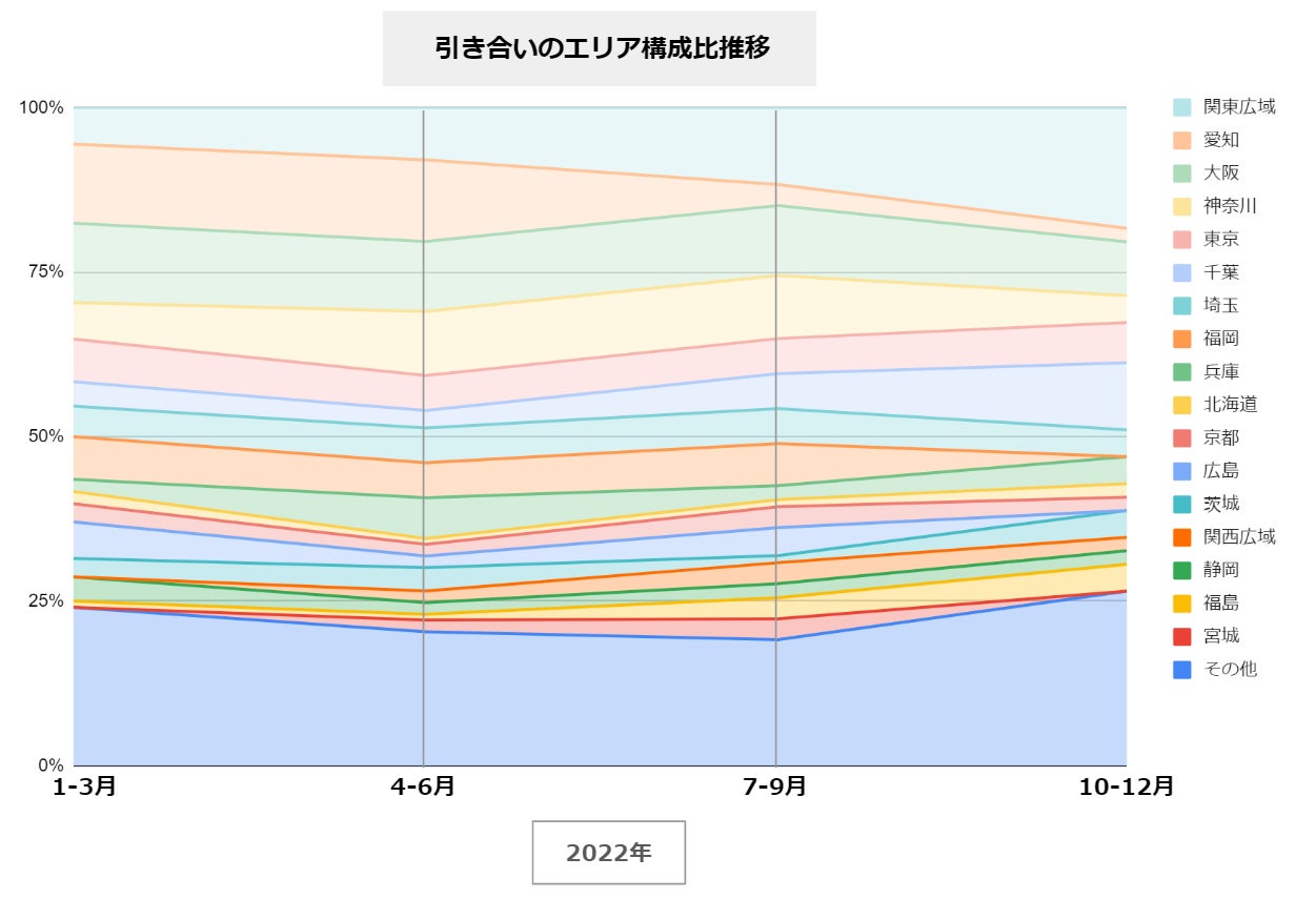 引き合いデータをエリアごとに分析した結果、都道府県別では愛知県が最も多くなりました。世界的な半導体不足や新型コロナによるサプライチェーンの乱れが2022年上半期に大きく影響したとみられ、8月終わり頃まで愛知県内の倉庫スペース不足が顕著だったことが主な理由と考えられます。秋以降の東海エリアの倉庫の需給バランスは改善傾向にあるようで、2023年は異なる分布になることが予想されます。