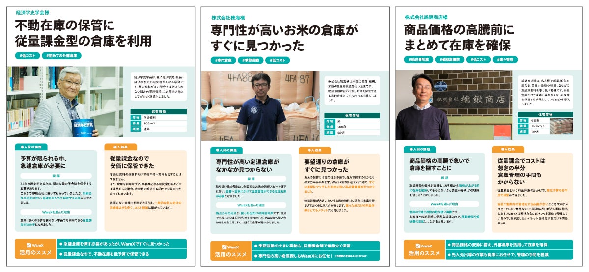 日本でも認知が広がりつつあるシェアリング倉庫サービスの具体的な利用イメージを持てるよう、導入事例の配布を開始しました。「ウェアエックス導入事例集」は以下よりダウンロードいただけます。