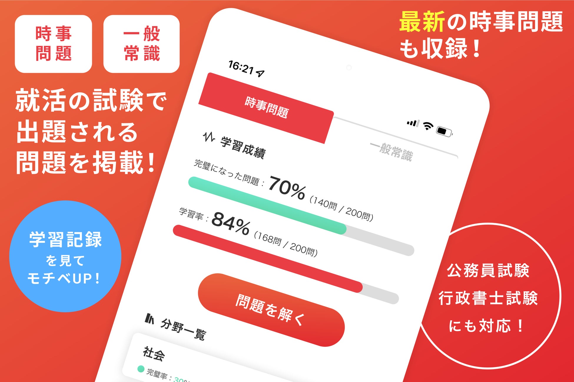 当社アプリは毎月最新の時事問題、そして頻出の一般常識問題を作成し、更新しております。時事問題・一般常識ともに政治・経済・社会など分野(科目)ごとに問題を掲載し、自分の解きたい分野に絞ったり、苦手な問題だけに絞ったりして解くことができます。さらに、普段なんとなく耳にするニュースも、詳しくはよくわからない…という人に向けて、政治や経済に関する知識がなくても分かるような丁寧な解説を用意しております。他にも苦手を分析したりモチベーションUPにもつながる「学習データ機能」、時事ニュースや一般常識の問題をまとめてチェックできる「暗記機能」などの時事問題・一般常識の対策がしやすいさまざまな機能を搭載しております。就職活動で忙しくニュースや新聞を読む時間が取れない就活生に向けたアプリで、通学時間などのスキマ時間を活用して効率よく対策できるアプリとなっております。