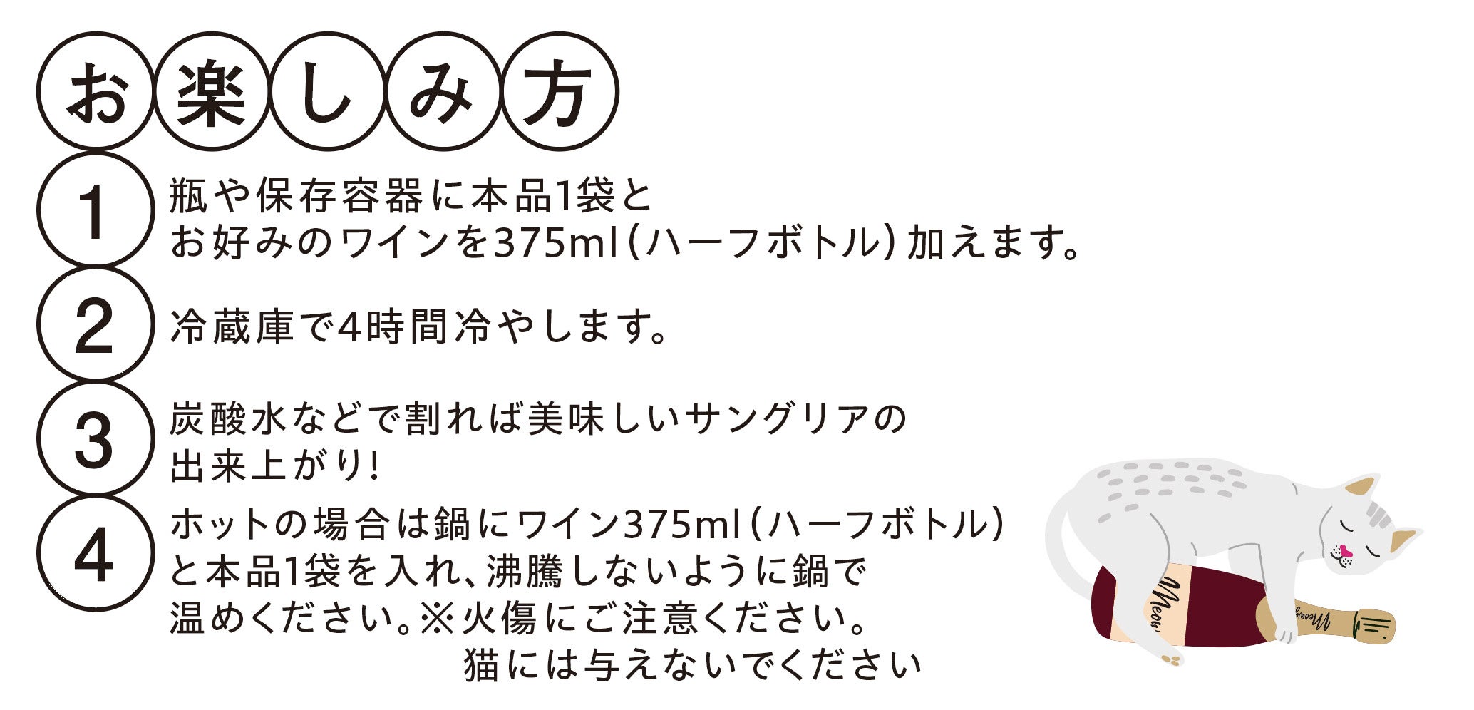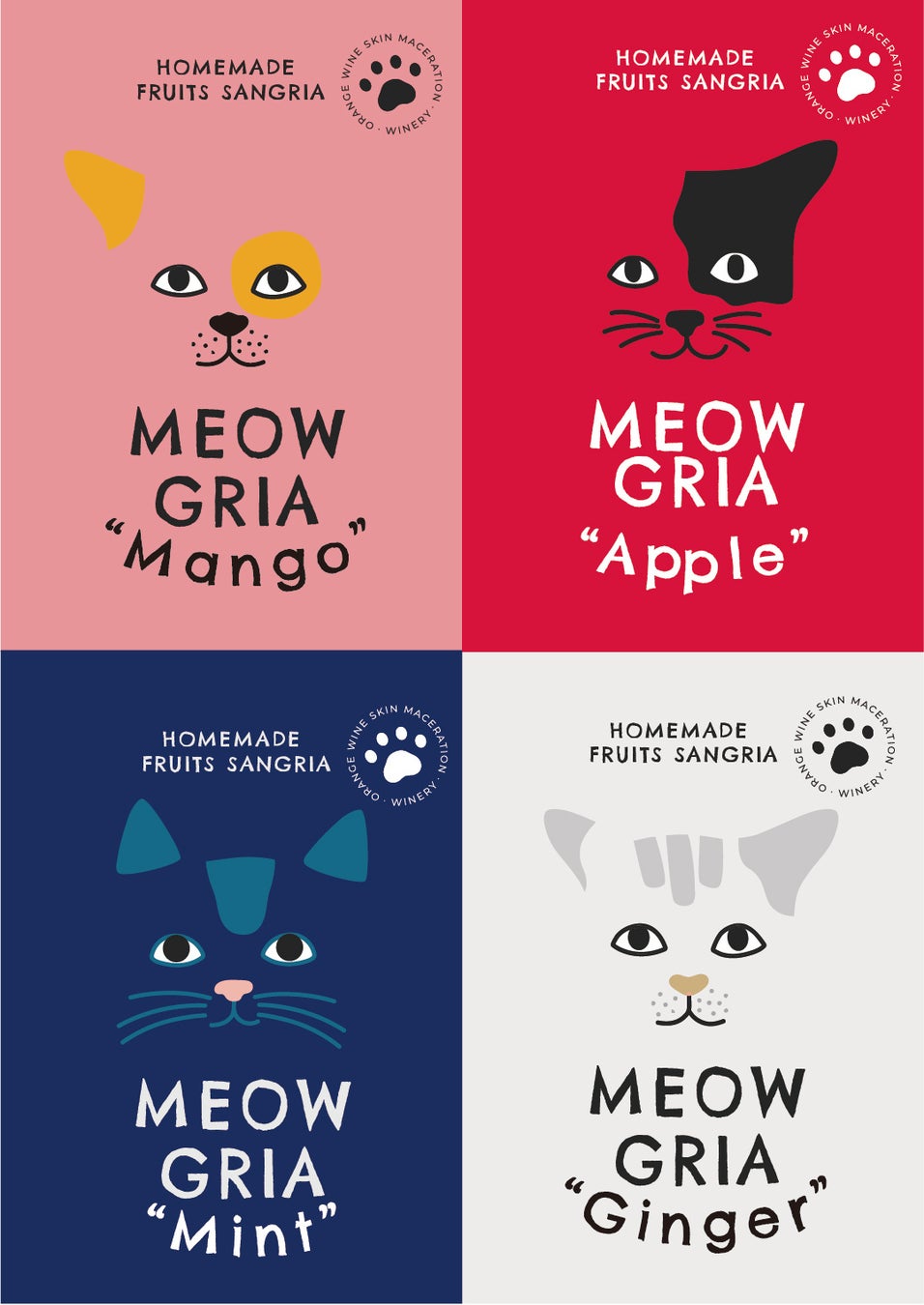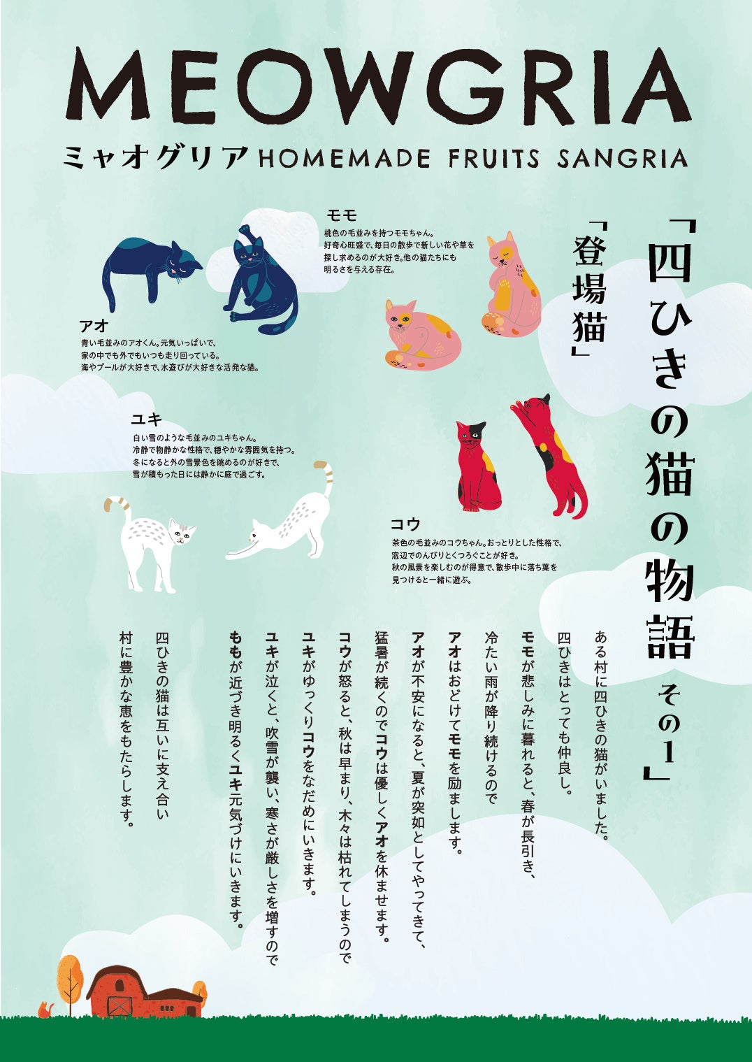 4匹の猫と4種のサングリアの素【MEOWGRIA-ミャオグリア】は 「季節を楽しむ」をテーマにした4種の自家製サングリアシリーズです。 四季折々に訪れる自然の変化や季節ごとの楽しみを4匹の猫の物語を 通して伝えるとともに、各季節ならではの魅力や味わい、 楽しみ方を提案します。 ホームパーティーやおもてなし、お祝い事、贈り物に最適です。 アルコールの苦手な方はノンアルコールワインでも 美味しくお召し上がりいただけます。 寒い季節はホットでもお楽しみいただけます。