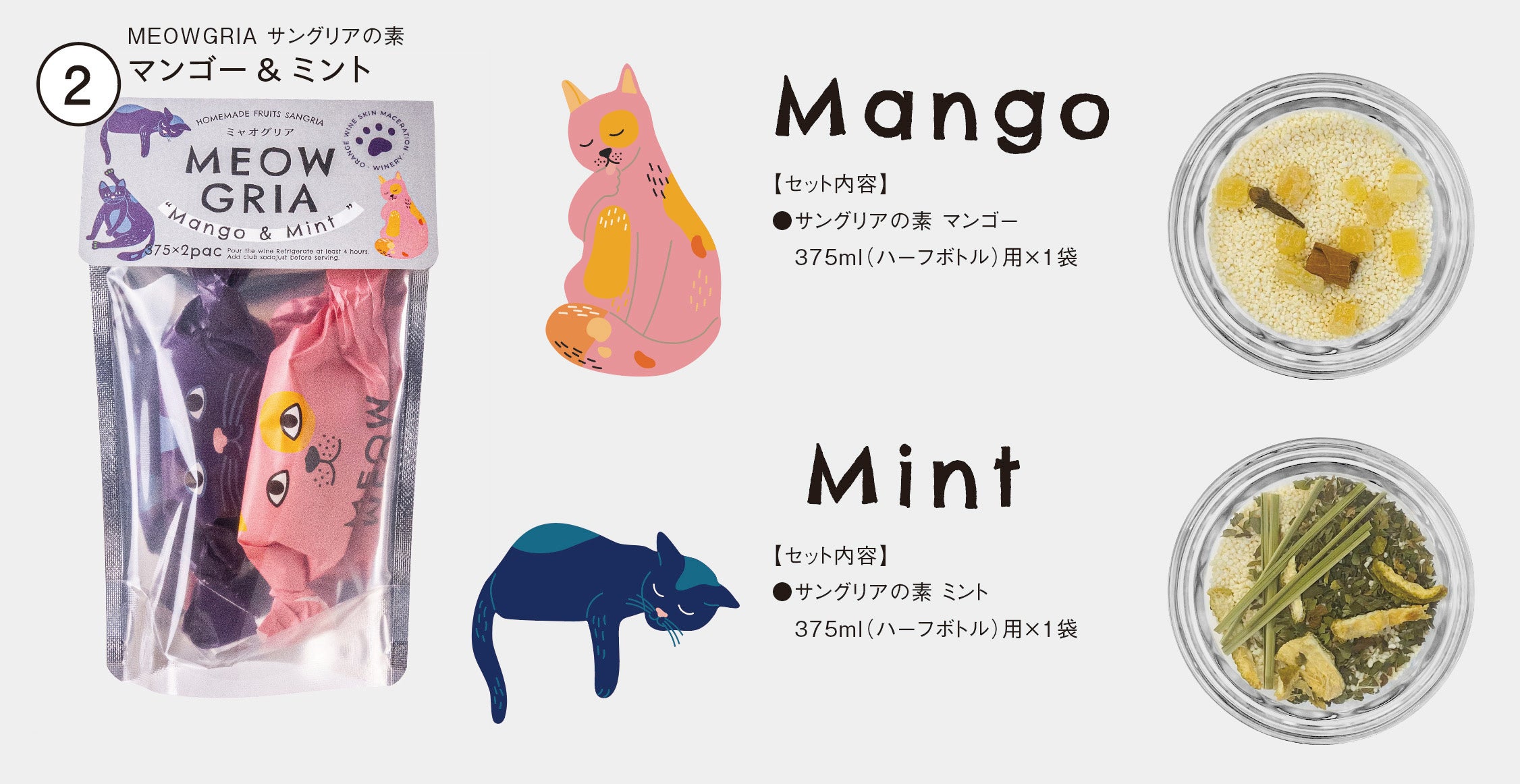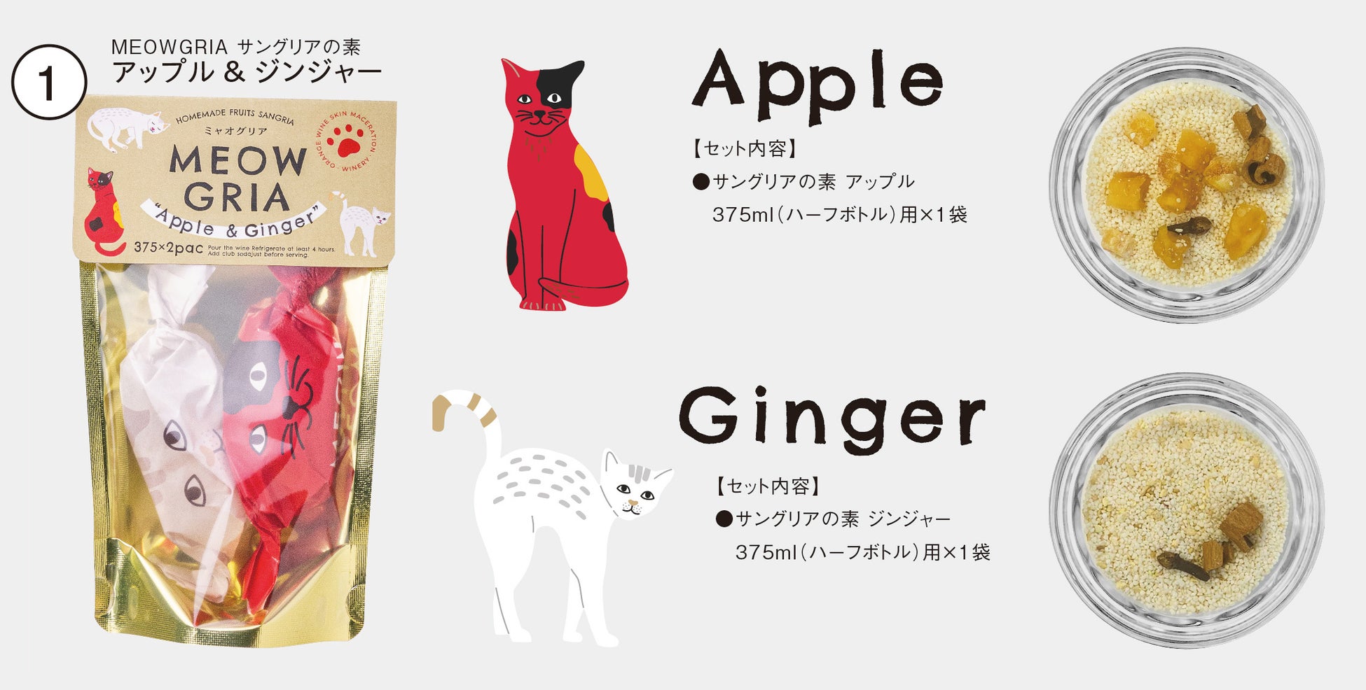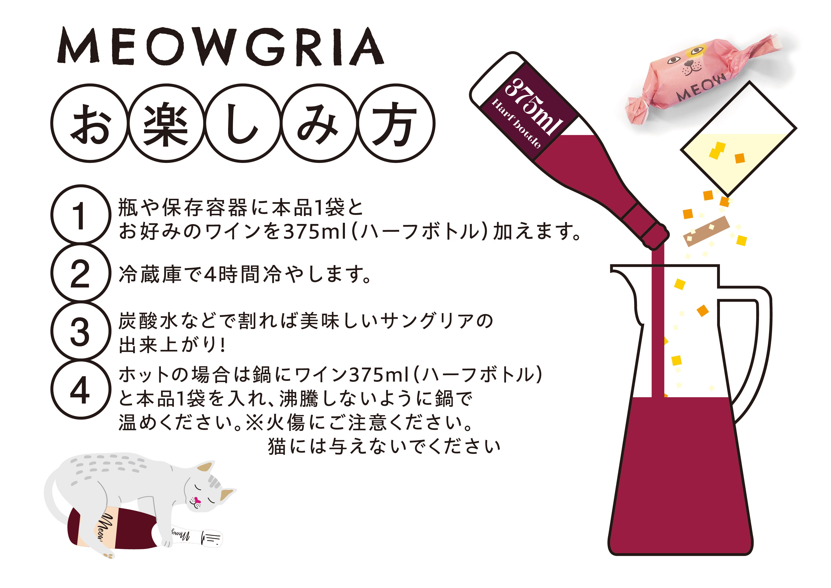 4匹の猫と4種のサングリアの素【MEOWGRIA-ミャオグリア】は 「季節を楽しむ」をテーマにした4種の自家製サングリアシリーズです。 四季折々に訪れる自然の変化や季節ごとの楽しみを4匹の猫の物語を 通して伝えるとともに、各季節ならではの魅力や味わい、 楽しみ方を提案します。 ホームパーティーやおもてなし、お祝い事、贈り物に最適です。 アルコールの苦手な方はノンアルコールワインでも 美味しくお召し上がりいただけます。 寒い季節はホットでもお楽しみいただけます。