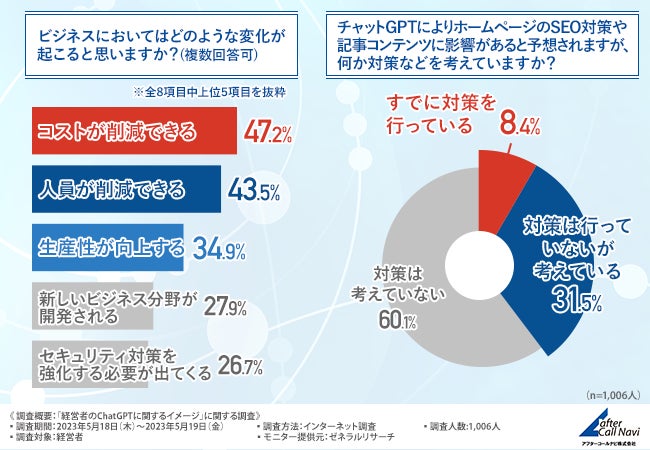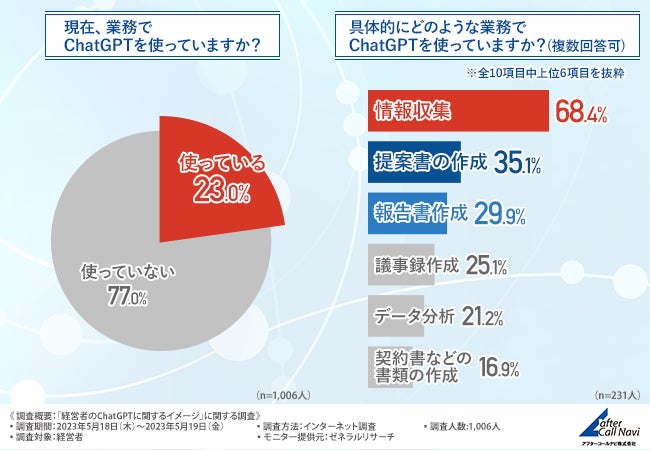 そこで今回、電話代行サービス「アフターコールナビ」(https://www.axs-f.com/)を運営するアフターコールナビ株式会社は、全国の経営者を対象に「経営者のChatGPTに関するイメージ」に関する調査を実施しました。