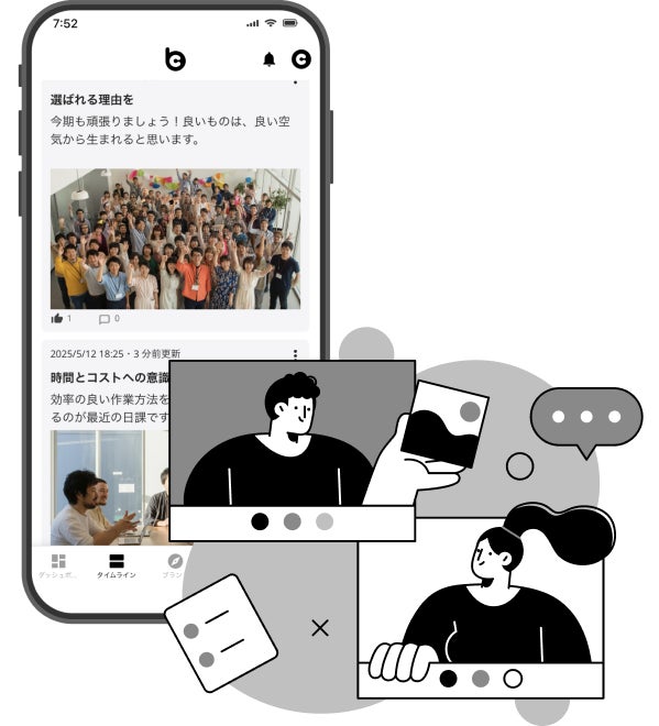 ブランド⼒を⾼める上で重要となる社員の意識向上や⾏動を促進する「Good Job タイムライン機能」を強化。予め策定した⾏動指針に沿った投稿を匿名で気軽におこなえる機能を実装。 またその投稿に対して「いいね」「コメント」 がおこなえ、 内部でのブランド浸透活動として社員同⼠のエンゲージメントが⾼まり伝播していく仕組みを構築。