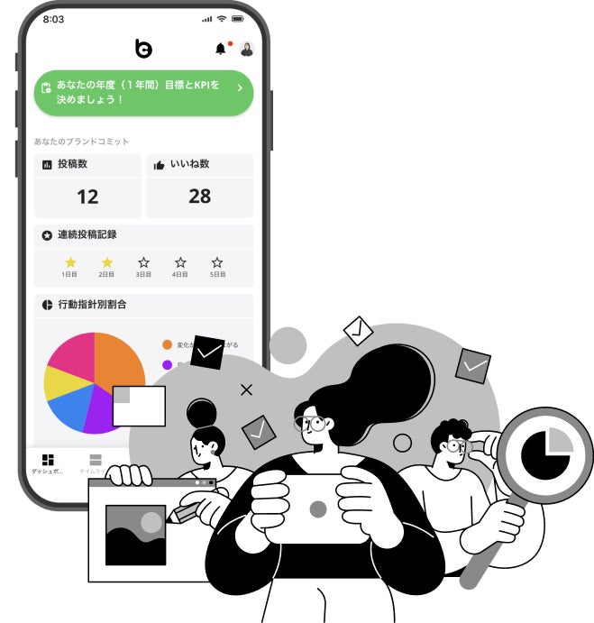 「Good job タイムライン機能」の⾏動指針別投稿数の時系列グラフ表⽰、「いいね」「コメント」数の集計グラフなど KPI 進捗レポートとして⾃動⽣成する機能を実装。 ブランドの浸透状況がリアルタイムで把握でき、課題領域の特定がスムースにおこなえます。