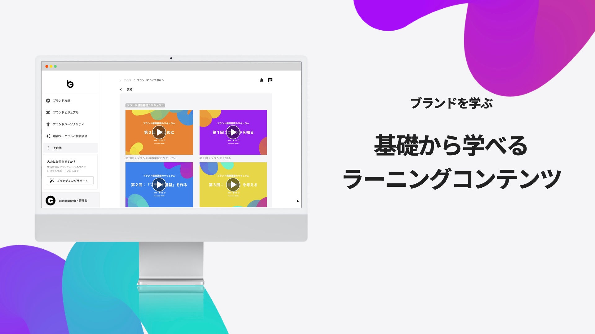 ブランディングの基礎から応⽤まで、 幅広いテーマを網羅する動画コンテンツを提供。 ブランディング初⼼者を含め社内での共通認識の⼟台づくりがおこなえるよう、コンテンツの構成をアップデートし拡充。