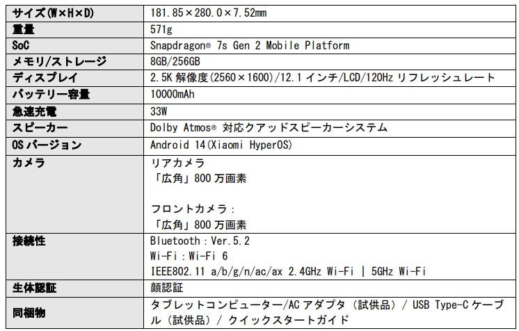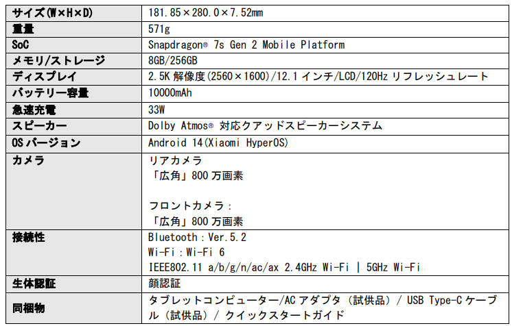 POCO Padは、2.5K解像度(2560×1600)で約12.1インチ、120Hzリフレッシュレート対応のディスプレイにより、映画鑑賞や、ゲームなどのエンターテインメントにハイレベルの視覚体験を提供します。日常使用に十分な「Qualcomm® Snapdragon™ 7s Gen 2 Mobile Platform」のチップセットを搭載します。また、10000mAhの超大容量バッテリーによって、長時間の使用もバッテリー残量を気にすることがありません。