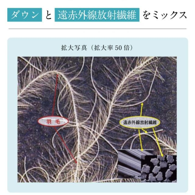 天然鉱石を配合した遠赤外線放射繊維を極小ファイバーまでカットし、ダウンとミックスした特殊加工です。