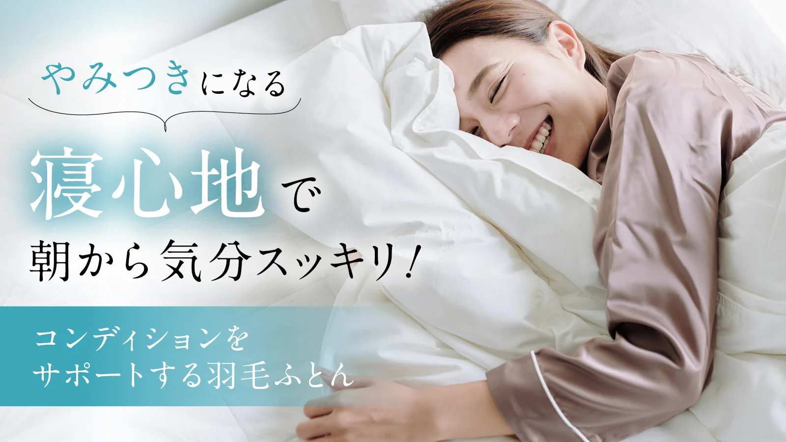 「コンディションをサポートする羽毛ふとん」は身体を温めてくれる遠赤外線放射繊維の力を借りて、気づけばスッキリした朝を迎えている羽毛ふとんです。その寝心地は極上。一度使えば手放せません