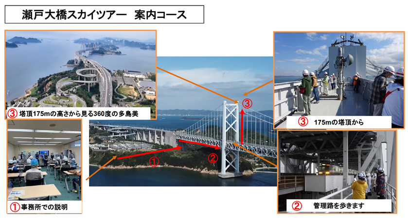 JB本四高速は、瀬戸大橋の歴史と技術を紹介し、普段立ち入りすることのできない管理路や塔頂をご案内する『瀬戸大橋スカイツアー』を、本年も新型コロナウイルス感染防止対策を徹底のうえ、開催いたします。
