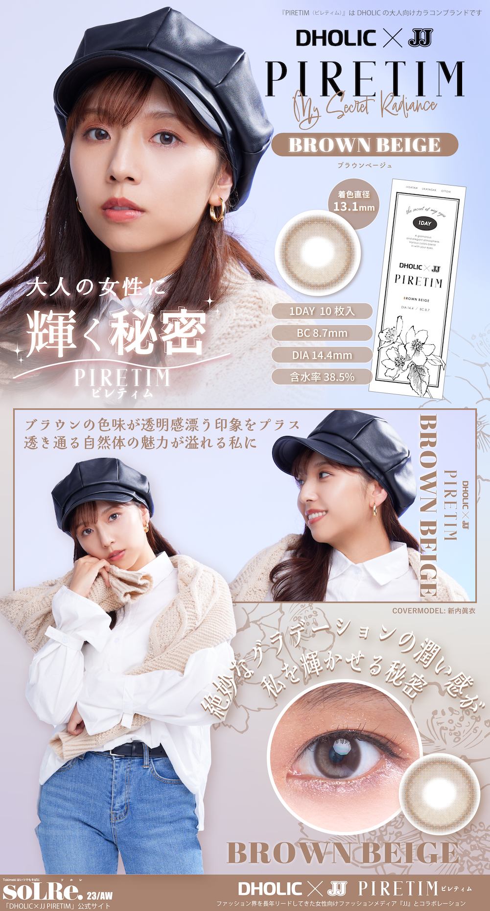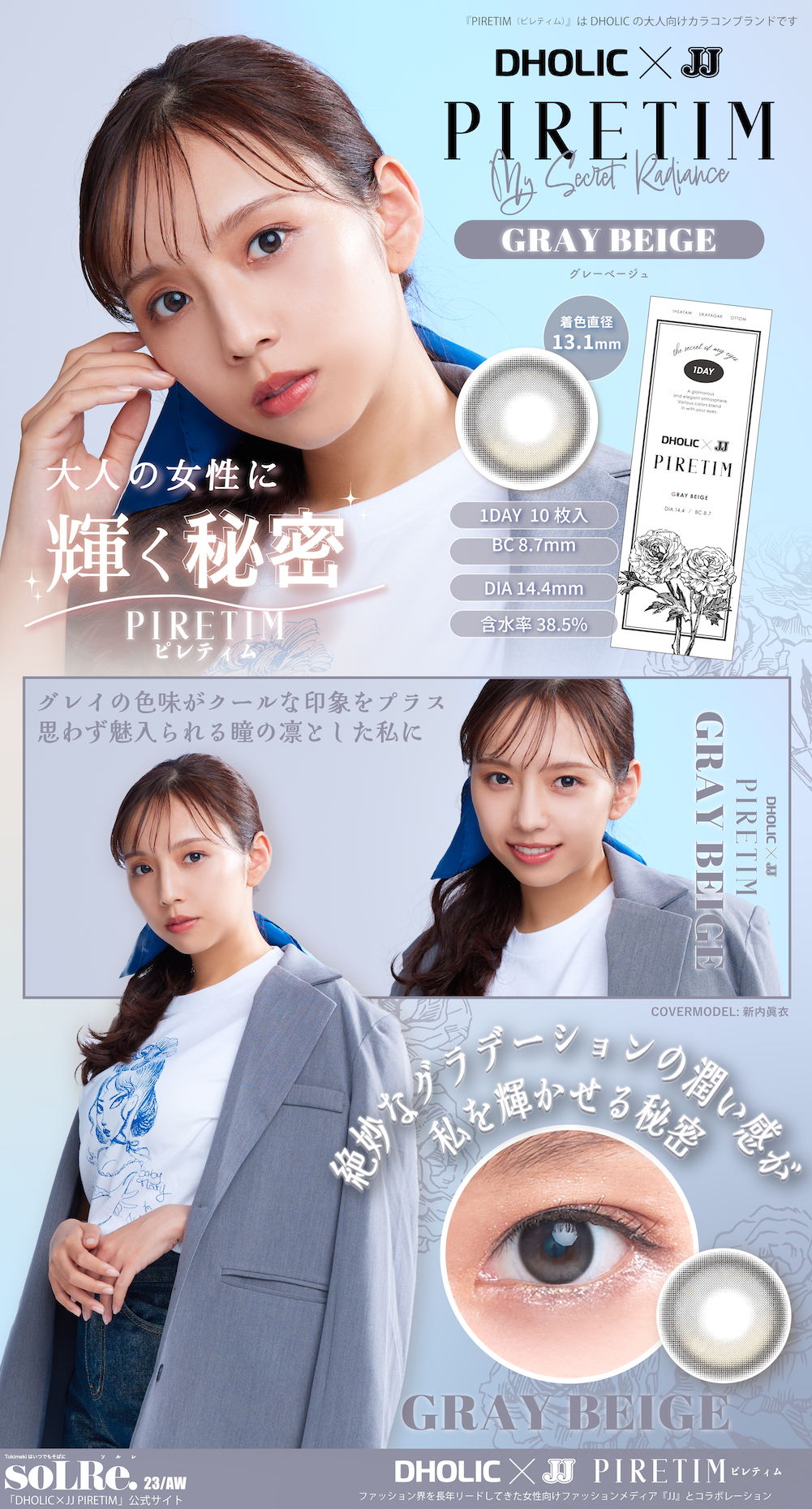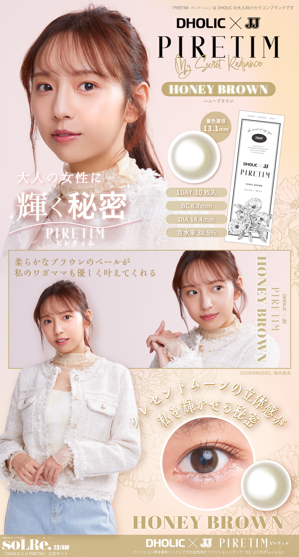 『PIRETIM』は、「私が輝く秘密」をコンセプトに『DHOLIC』が立ち上げた大人向けカラコンブランド。ファッション界を長年リードしてきた女性ファッションメディア『JJ』とコラボし、幅広い年代、特に大人の女性が自然に盛れるカラコンを楽しんでもらいたいという想いのもと制作。幅広い女性の声をリサーチした結果、「不自然にならず、程よく盛れるカラコン」が誕生しました。