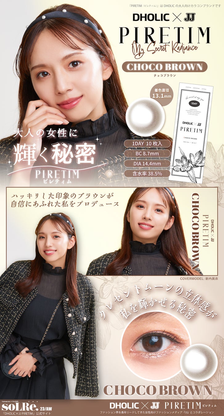 DHOLIC公式ショップ『soLRe.(ソルレ)』ではカバーモデルを起用して、「DHOLIC×JJ PIRETIM」の“不自然にならず、程よく盛れる”というポイントを生かし、全7色それぞれとマッチするメイク&スタイルをシーズンごとに紹介。2023A/Wのカバーモデルは、モデル・タレントとして活躍されている元乃木坂46の新内眞衣さん。プライベートなシーンに加えて、職場など日常の幅広いシーンでナチュラルで魅力的な瞳を楽しめます。