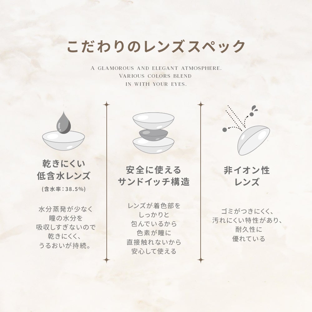 今までのカラコンにあった“盛りすぎ”てしまうことを恐れずに使用できることが最大のポイント。好きなメイクやファッションに合わせて楽しむことができる自然な印象の水光カラコンで、常に光を取り込んでいるように見えるのに裸眼っぽく使用できるので「いかにもカラコン付けて盛ってます!」という状態がなくなります。13mmに0.1mmだけ輝きの秘密を入れ、さらにフチをドット状の細めにすることで欲しかったナチュラルさとくっきりさを表現。低含水レンズが涙を吸収しすぎず目が乾きやすい人や長時間着用したい人にオススメです。いつもの印象を自然なふうに変えたいという大人女子必見のカラーは全7色の展開です。