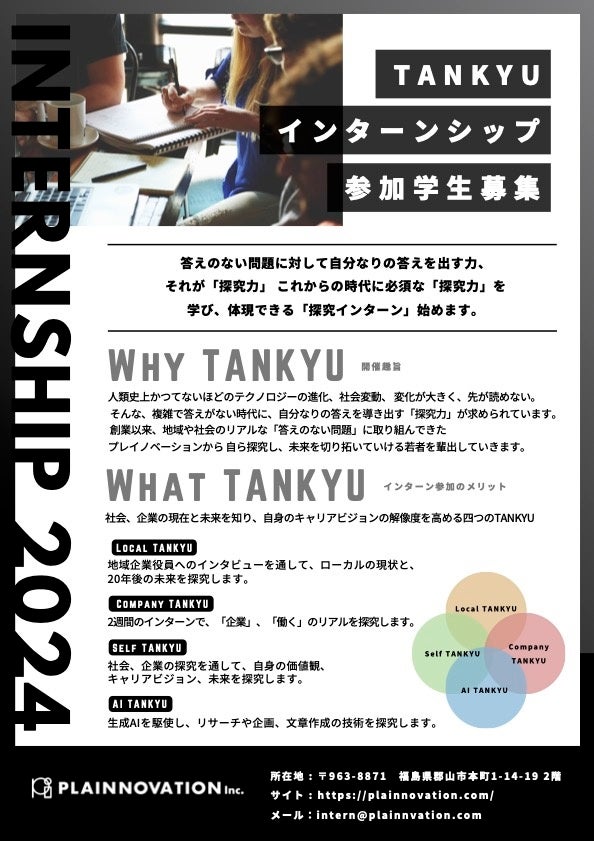 地域企業のデジタルトランスフォーメーション(以下DX)推進を手がける株式会社プレイノベーション(本社:福島県郡山市、代表取締役社長:菅家元志、以下プレイノベーション)は、学生・企業の方々向けに「地域の次の100年を切り開く探究インターンシッププログラム」の企画・運営の開催を目的とし、本日2024年2月16日(金)13時より、クラウドファンディングを開始いたします。