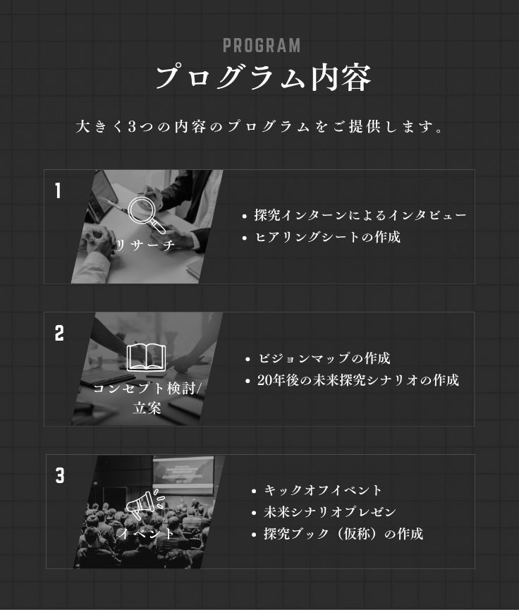 プログラムの内容としては、①地域企業経営者が構想しているテーマや取り組む新規事業や今後の企業ビジョンについて学生がインタビューし、②それをもとに学生の自由な発想で20年後・100年後のビジョンを纏めプレゼンテーションとしてお返しし、③これら一連の取り組みを郡山市内の高校向けに探究教材として配布する、といった内容を予定しております。