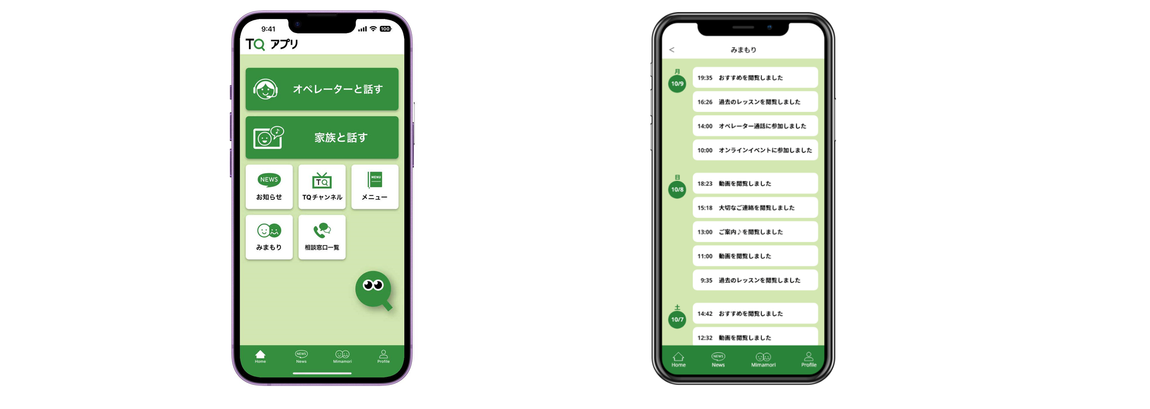 TQアプリではTQタブレットの利用履歴が確認できるので、利用状況を定期的に確認し見守ることができます。またオペレーターとの会話やTQコネクトが企画するオンラインイベントにも親子で簡単に参加が可能です。