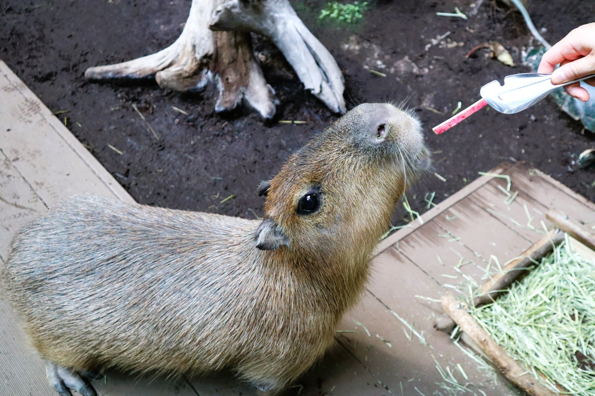 登場いたします。通常の青草にカピバラたちの大好物である「サツマイモ」を追加し、